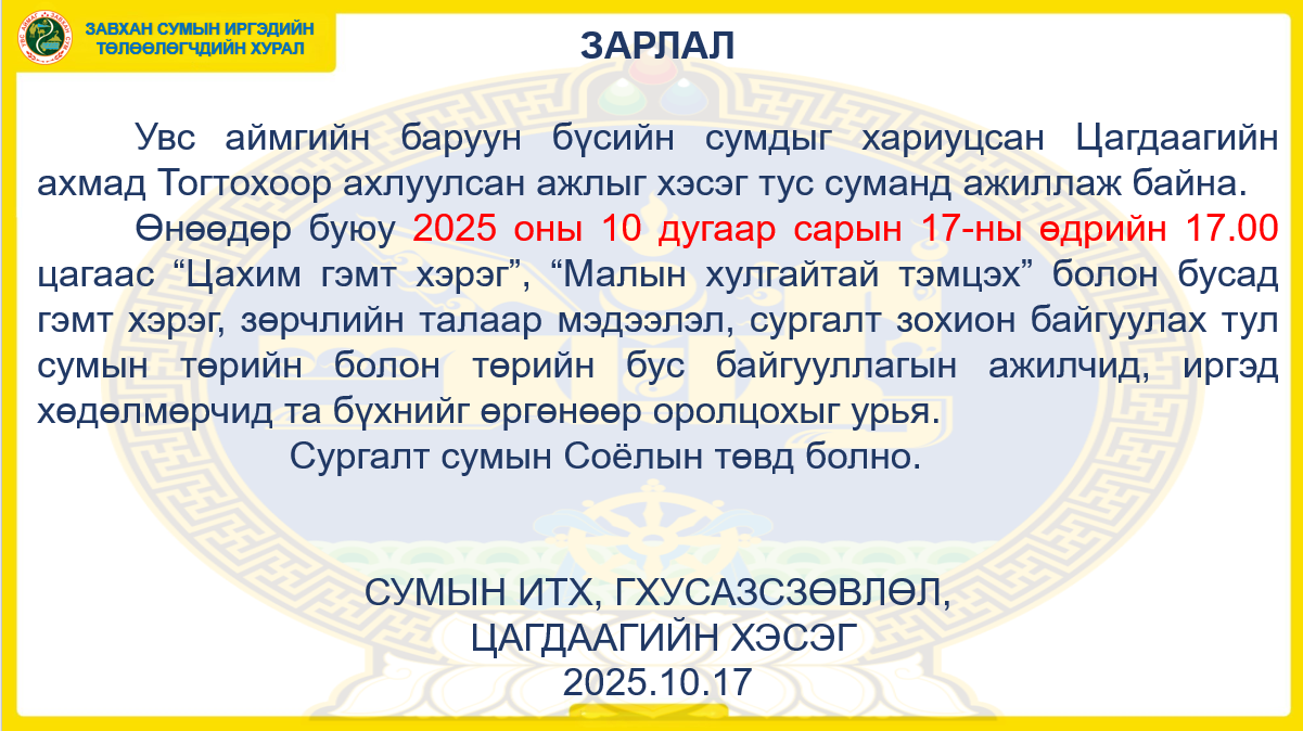 Өнөөдөр буюу 2025 оны 10 дугаар сарын 17-ны өдрийн 17.00 цагаас “Цахим гэмт хэрэг”, “Малын хулгайтай тэмцэх” болон бусад гэмт хэрэг, зөрчлийн талаар мэдээлэл, сургалт зохион байгуулах тул сумын төрийн болон төрийн бус байгууллагын ажилчид, иргэд хөдөлмөрчид та бүхнийг өргөнөөр оролцохыг урья.