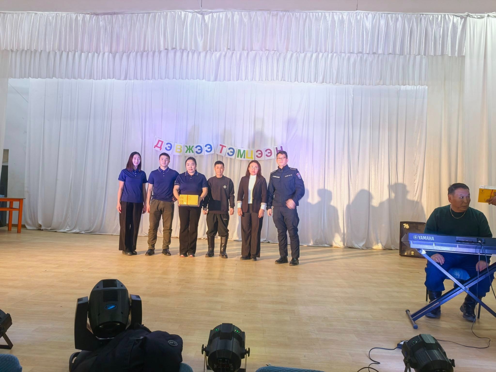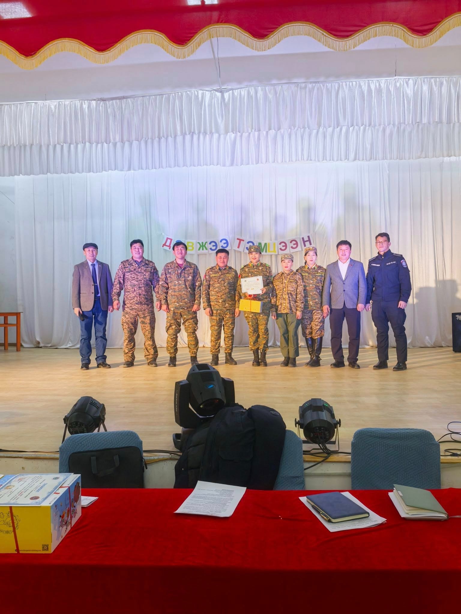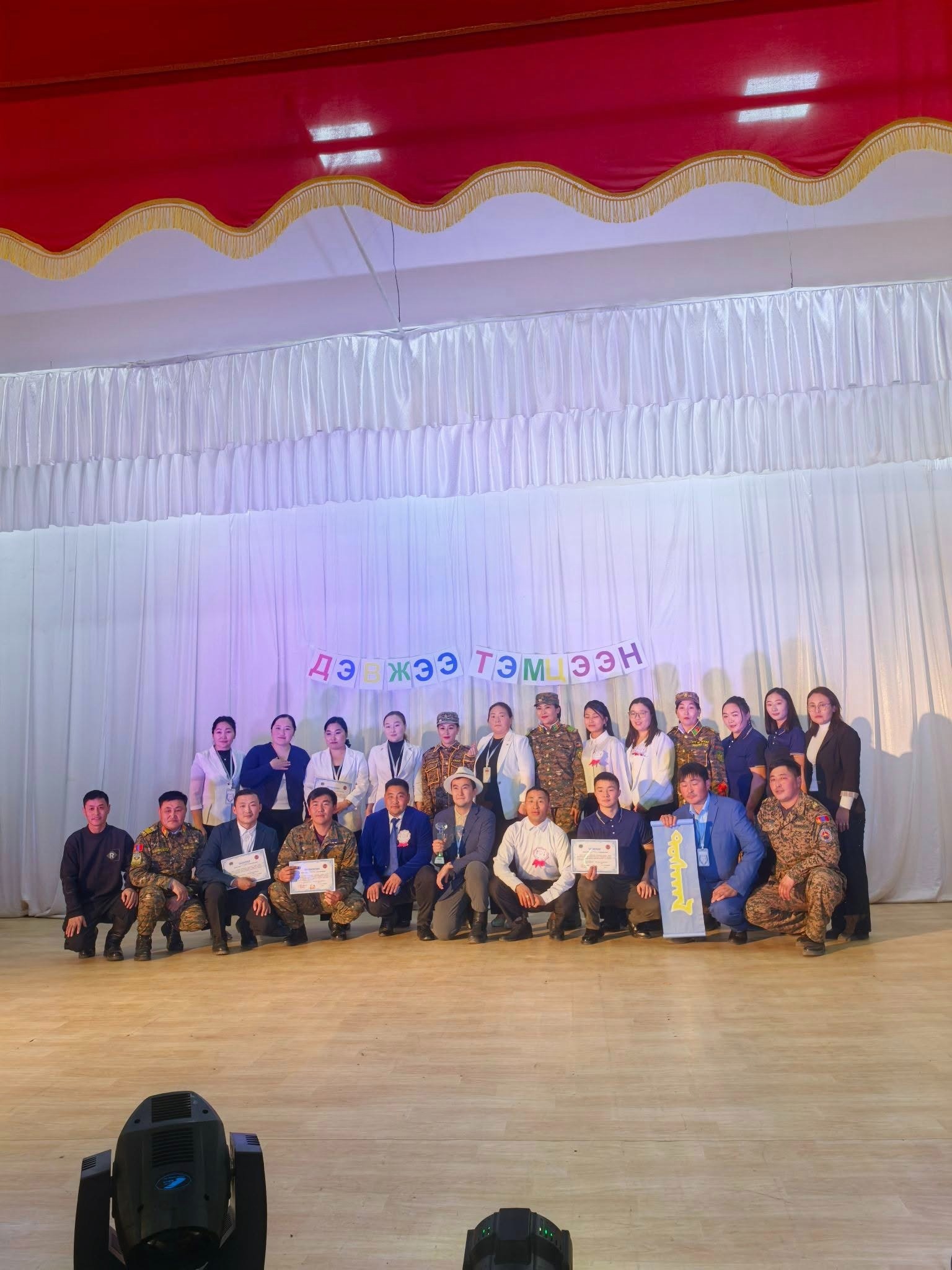 Сумын Гэмт Хэргээс Урьдчилан Сэргийлэх Ажлыг Зохицуулах Салбар Зөвлөлөөс төрийн байгууллагуудын дунд зохион байгуулсан "Бид хуулийн хүрээнд амьдардаг" сэдэвт ДЭВЖЭЭ тэмцээнд Сумын ЗДТГ, Эрүүл мэндийн төв, ЕБСургууль, Цэцэрлэг гэсэн 4 байгууллагын 24 алба хаагч оюун ухаан, авьяас, чадвараа дайчлан оролцсоноос :
